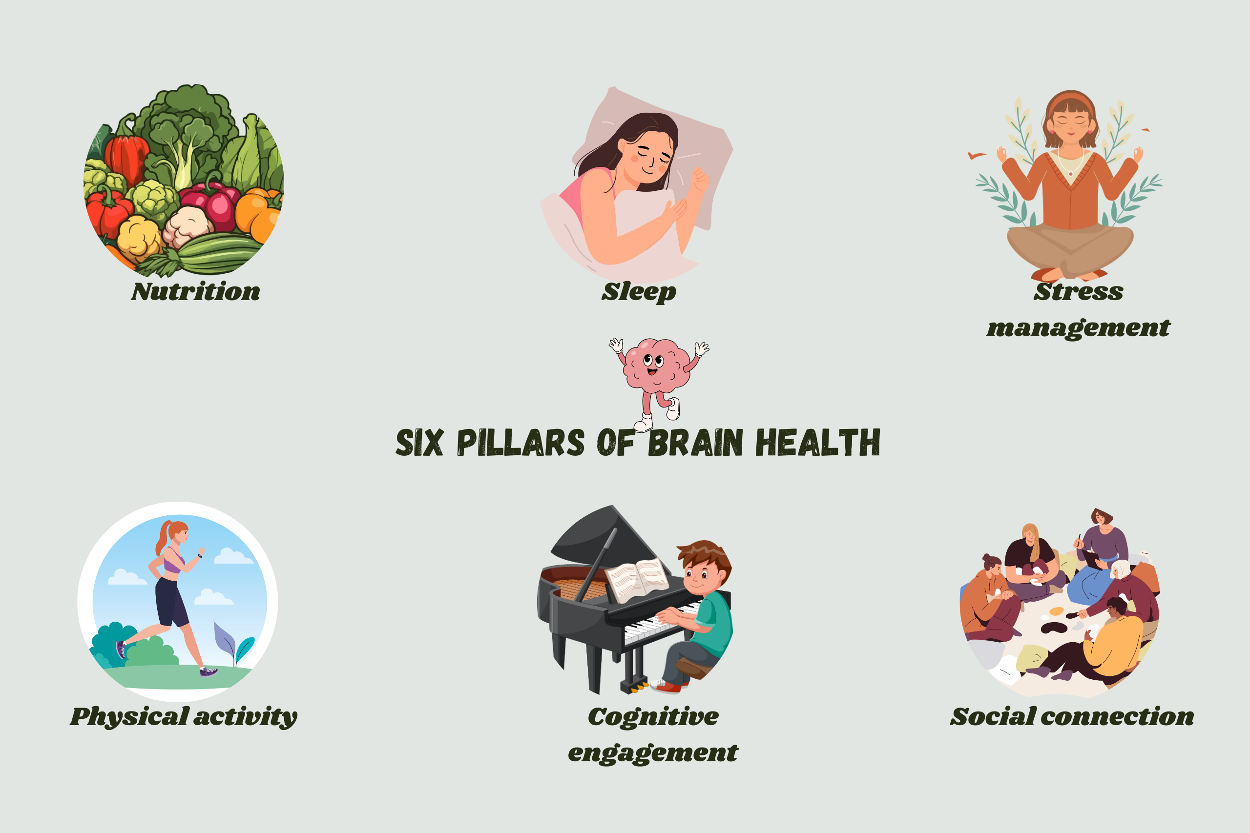 The encouraging message is that everyday choices matter. Six areas in particular—Nutrition, Physical activity, Cognitive engagement, Social connection, Sleep, and Stress management—are consistently linked with brain health. Each factor contributes on its own, but their combined effect is stronger. In a large study, adopting two to three healthy habits reduced the risk of Alzheimer’s disease by 37%, while following four or five habits lowered it by 60% (Dhana et al., 2020; Rush Alzheimer’s Prevention News, 2020).
